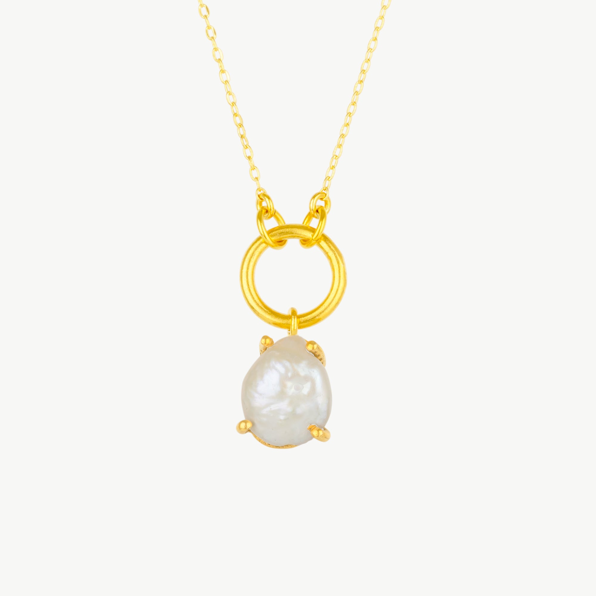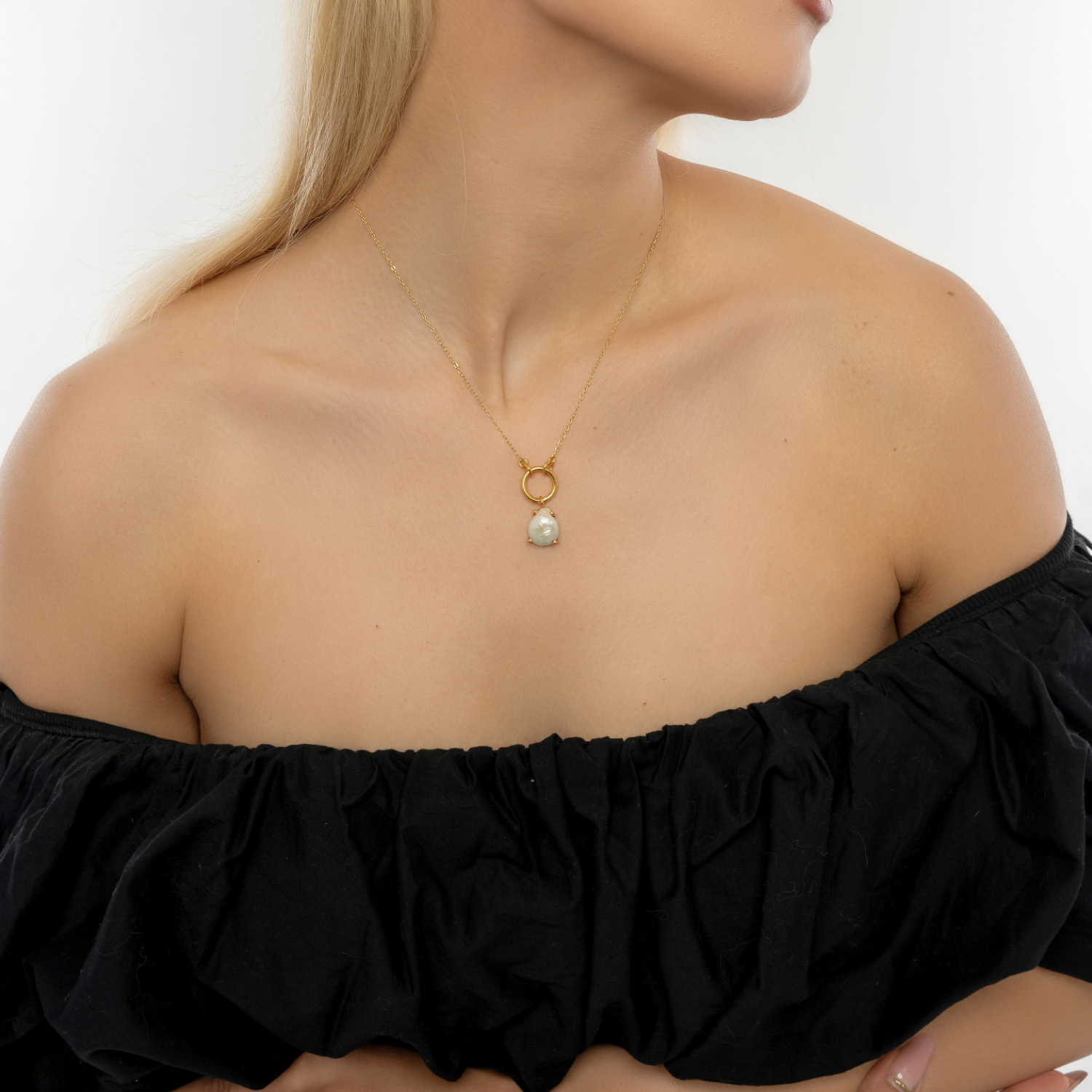 Introducing our stunning Baroque Keshi Pearl Gold Pendant Circle Necklace. This elegant piece features a unique baroque Keshi pearl set in a delicate gold pendant in a circular shape. Impress and inspire with the beauty and sophistication of this necklace.