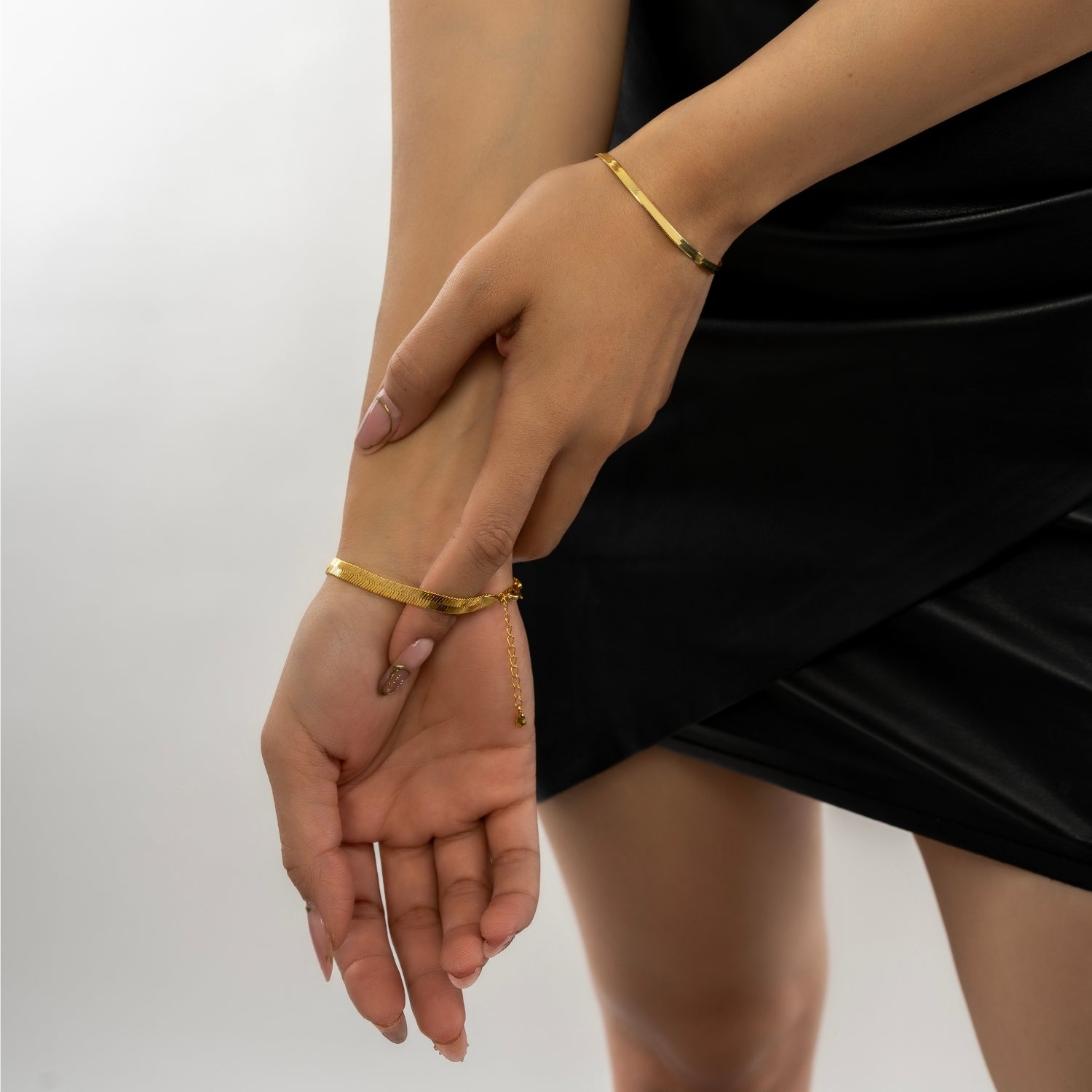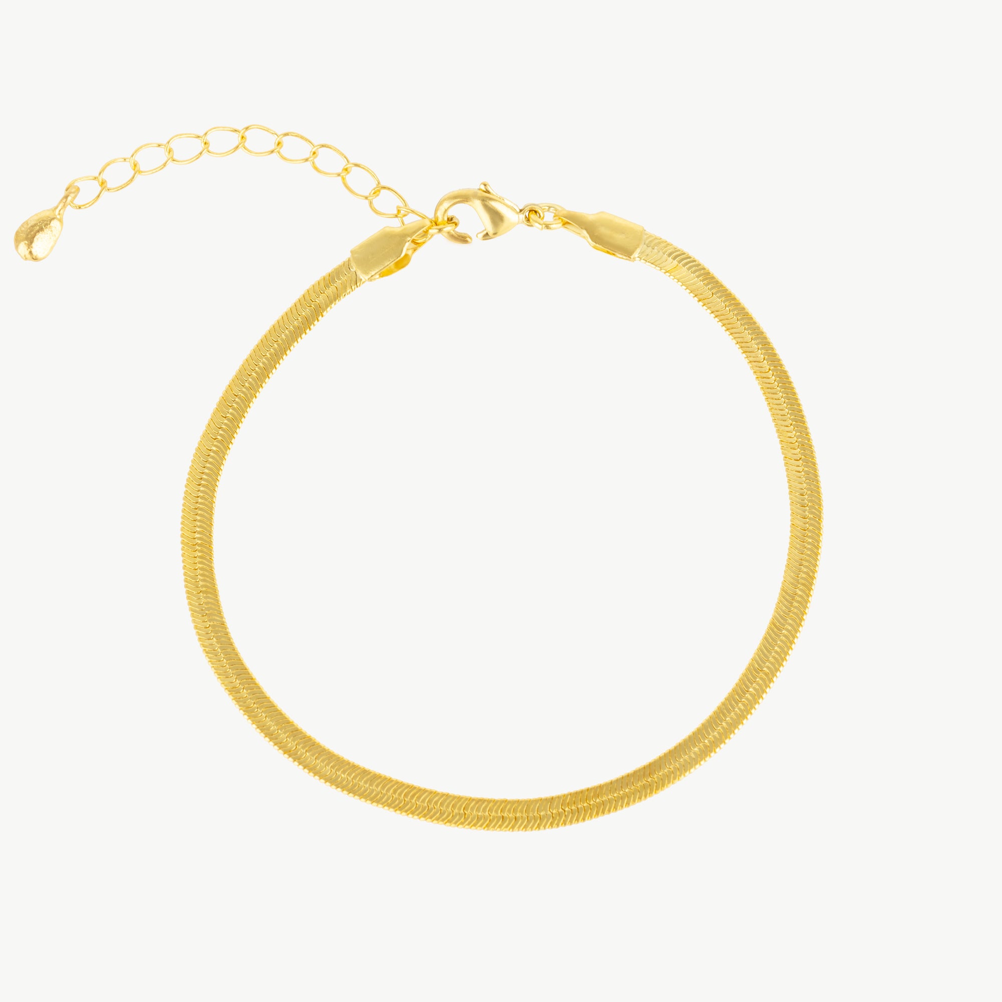 Effortlessly elevate your style with our Flat Herringbone Gold Bracelet. Made with high-quality materials, this sleek and modern design adds a touch of sophistication to any outfit. Perfect for day or night, this bracelet is sure to become your go-to accessory.