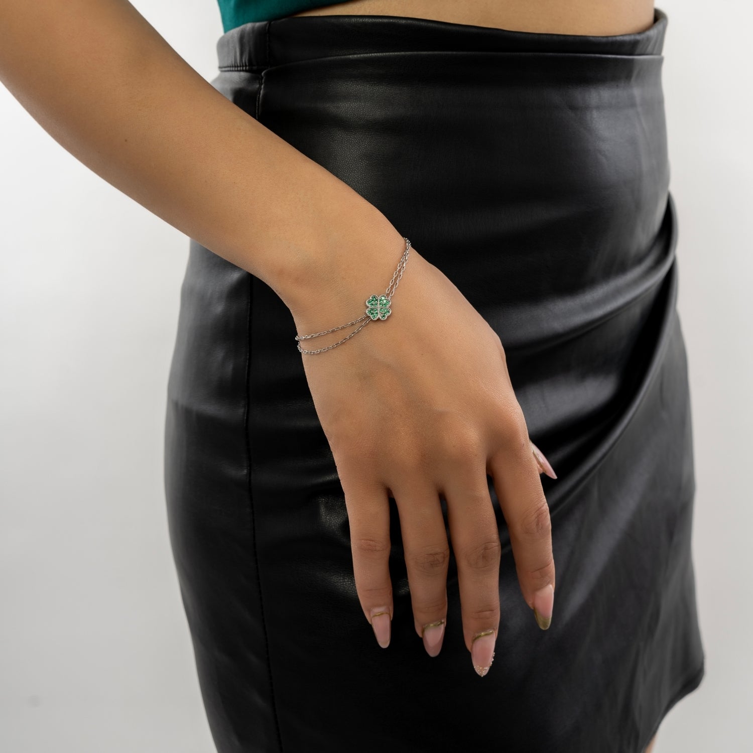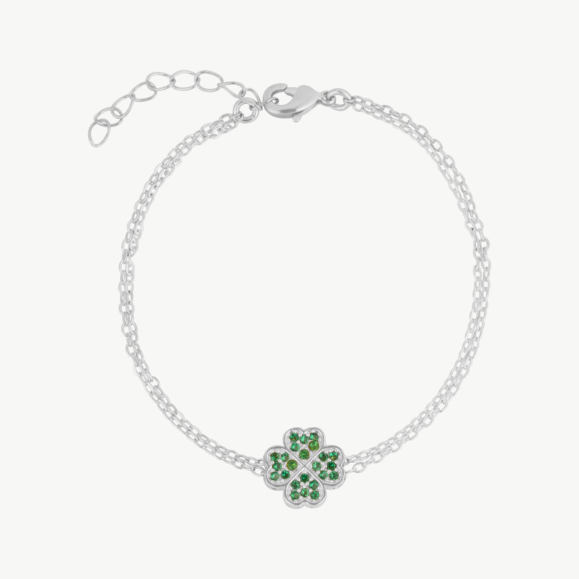 Add a touch of luck to your outfit with our Four Leaves Clover Bracelet! Made with silver and adorned with sparkling clear gemstones, this bracelet is sure to catch the eye and bring good fortune. A perfect accessory for any occasion.