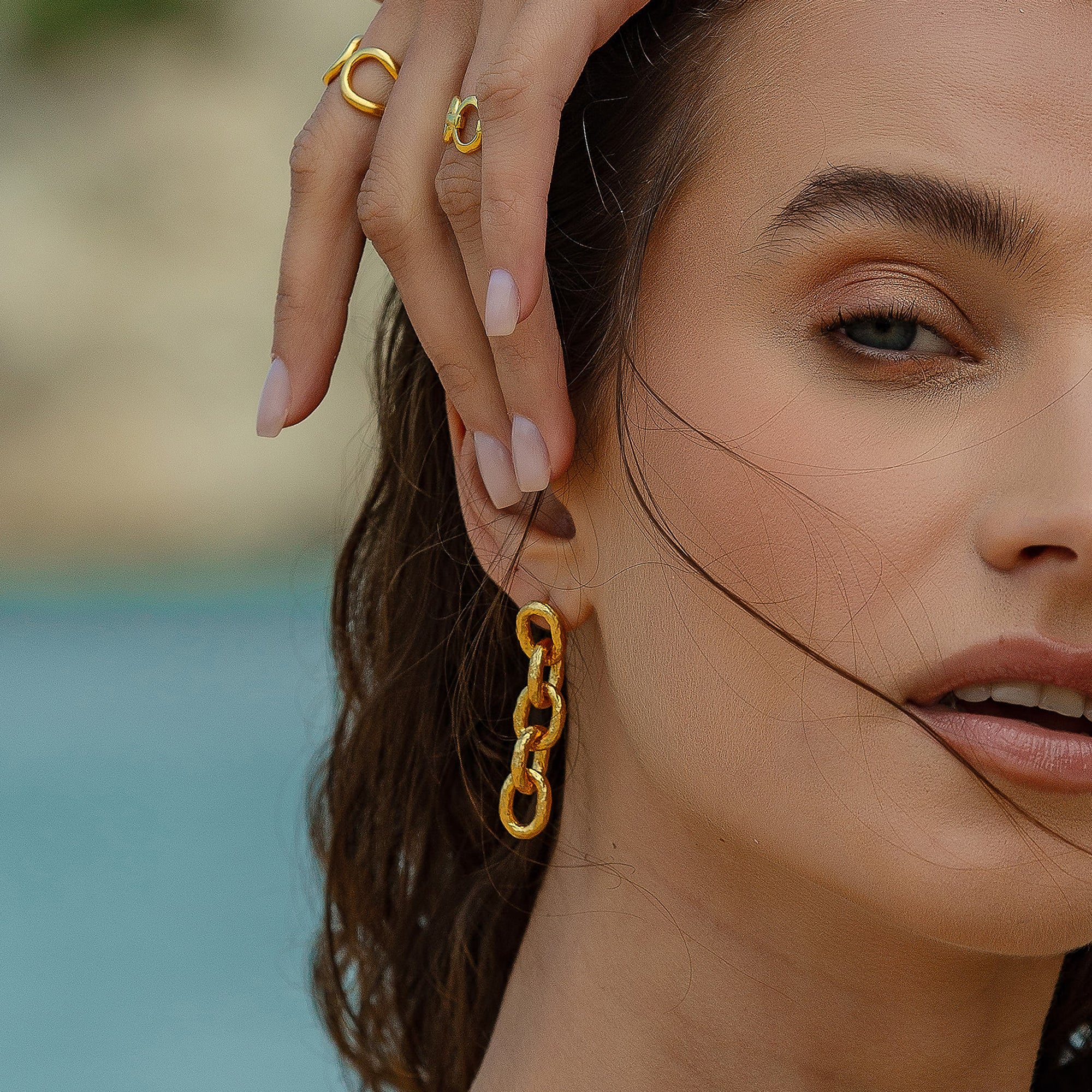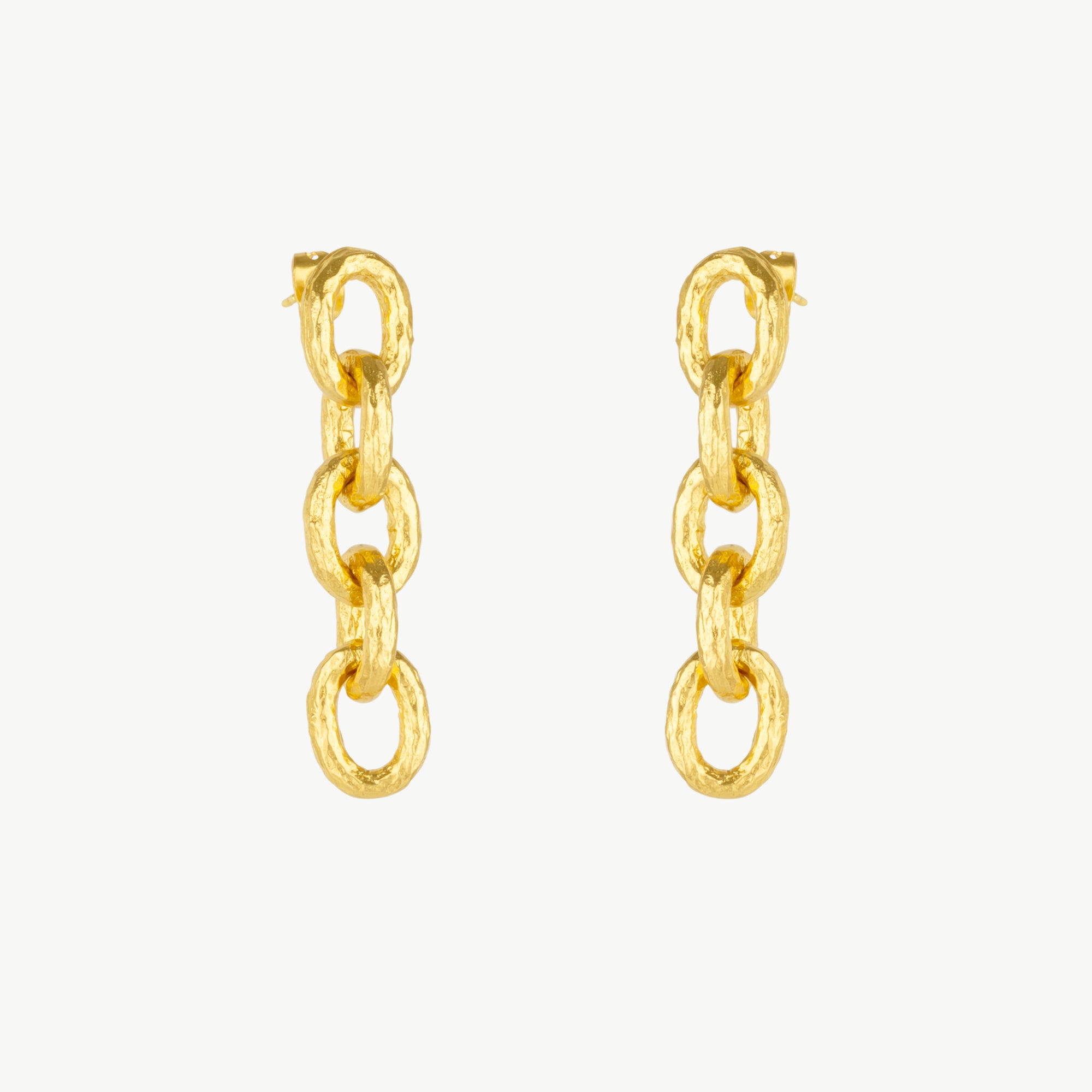 Indulge in the luxurious elegance of our Golden Hammered Link Chain Drop Earrings. Handmade with a stunning textured finish, these earrings add a touch of sophistication to any outfit. Elevate your style and turn heads with these mesmerizing earrings.