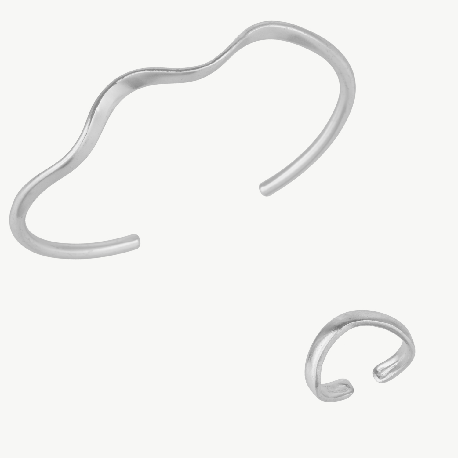 Indulge in luxury with our Molten Wavy Cuff Bangle Silver Bracelet & Elegance Silver Wavy Ring Set. With their intricate wavy designs, these pieces exude elegance and sophistication. The perfect addition to elevate any outfit, these handcrafted pieces are sure to make you stand out.