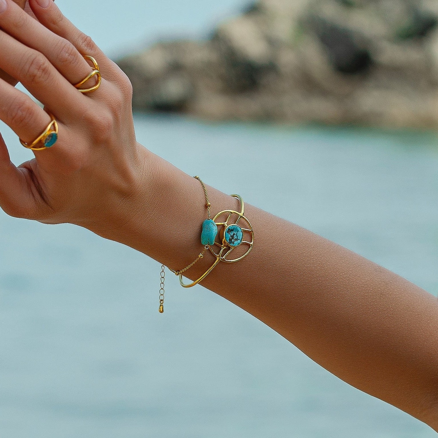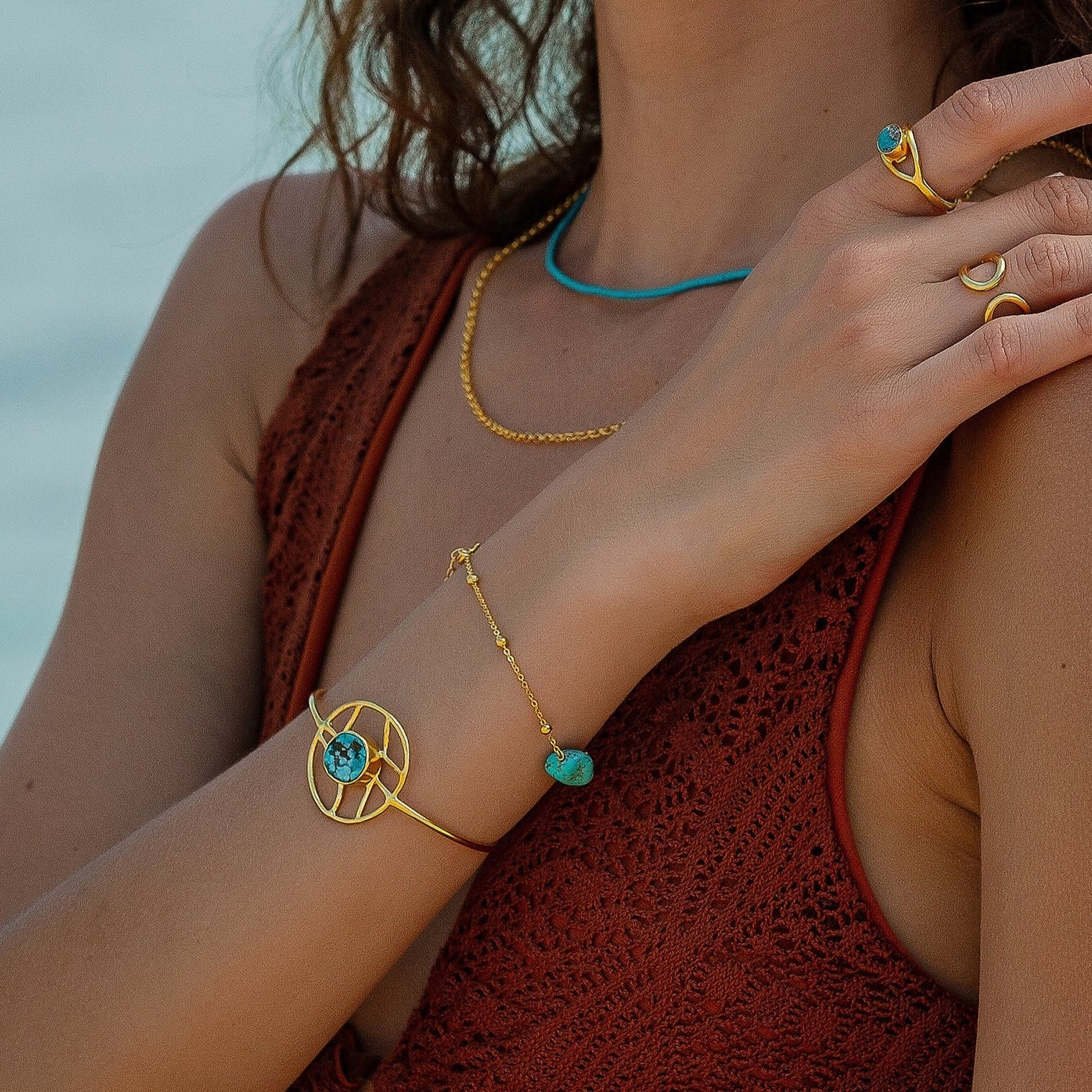 Add a touch of ocean-inspired elegance to your ensemble with our Oceanic Orb Adjustable Turquoise Cuff Bangle in Gold. The beautiful turquoise stone and adjustable design make it a versatile and stylish accessory for any occasion. Elevate your look and make a bold statement with this beautiful bangle!