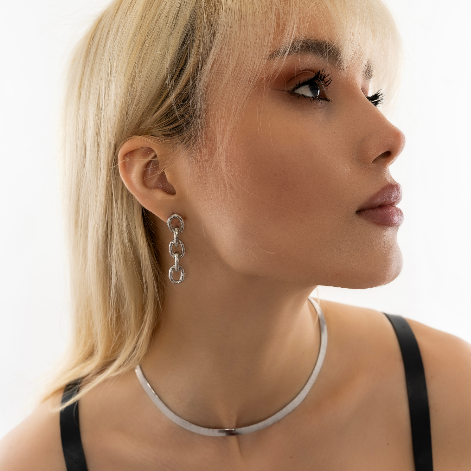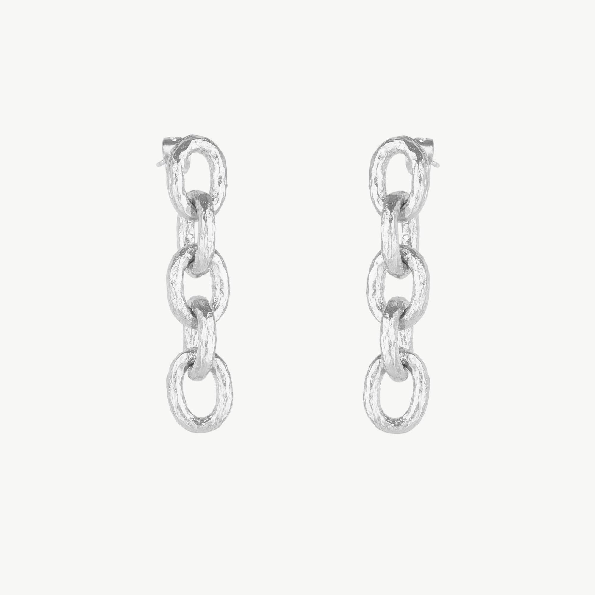 Indulge in the luxurious elegance of our Silver Hammered Link Chain Drop Earrings. Handmade with a stunning textured finish, these earrings add a touch of sophistication to any outfit. Elevate your style and turn heads with these mesmerizing earrings.