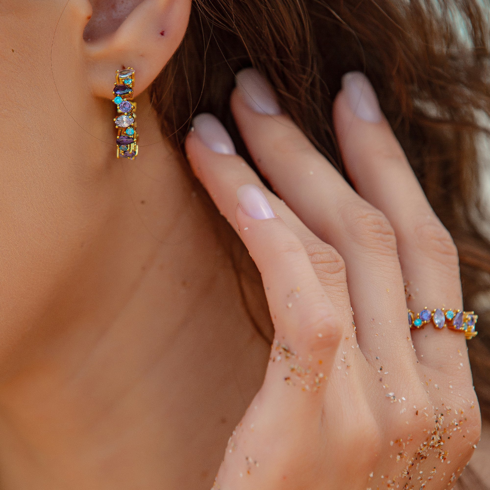 Add a touch of elegance and beauty to any outfit with our Textured Cubic Zirconia Gold Floral Hoop Earrings. These stunning earrings feature intricate floral designs and sparkling blue and amethyst cubic zirconia stones. Perfect for any occasion, they are sure to make a statement and leave a lasting impression. Elevate your style today!