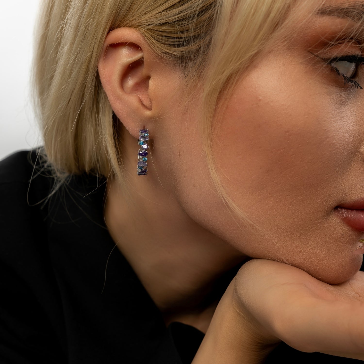 Add a touch of elegance to your outfit with our Textured Cubic Zirconia Silver Floral Hoop Earrings. The intricate floral design, paired with the bold blue and amethyst colors, will make you stand out in any crowd. These earrings are perfect for any occasion and will add a sparkle to your look.