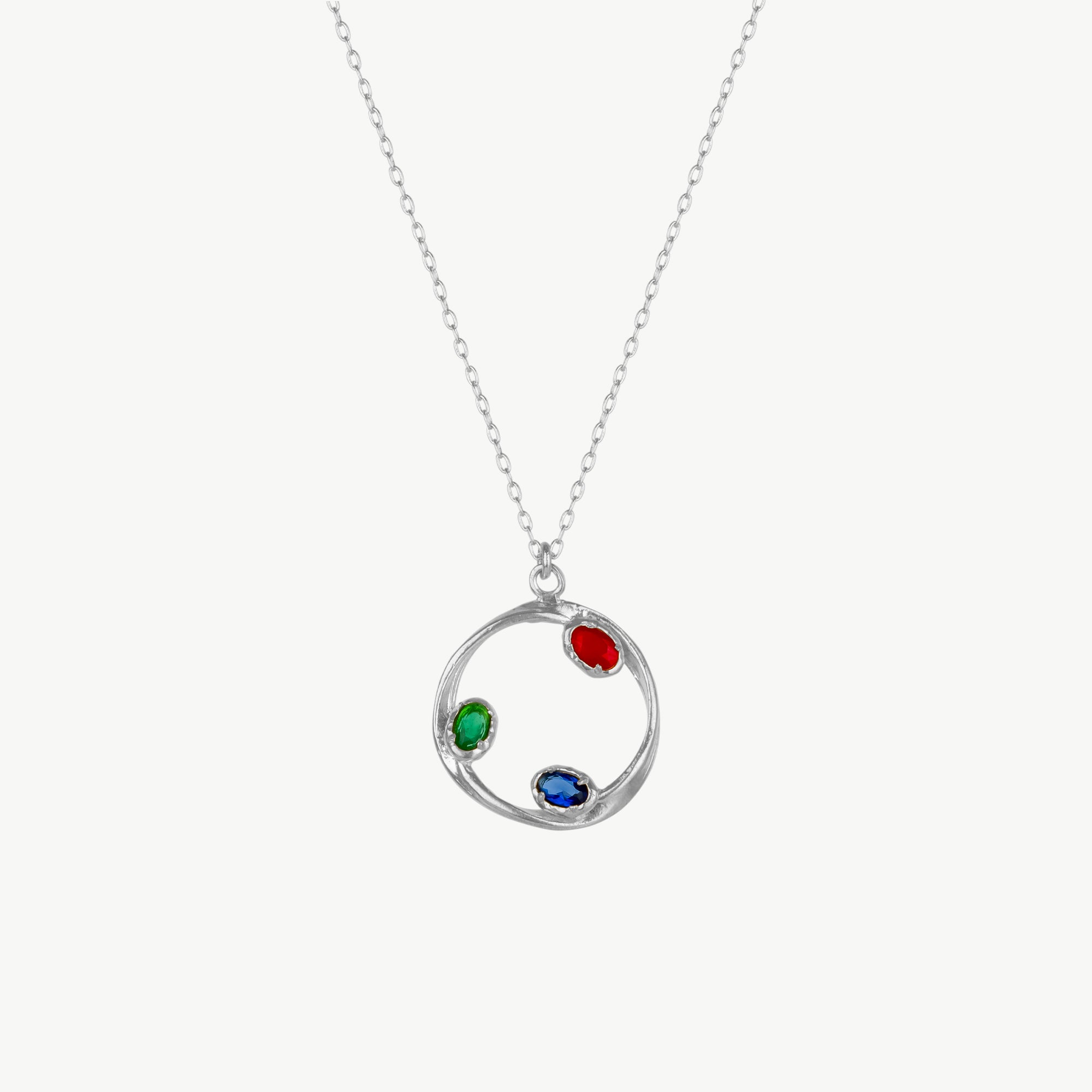 This elegant Tri-Gem Harmony Silver Pendant Necklace is the perfect accessory for any outfit! The three sparkling gems add a touch of sophistication and the gold chain complements any skin tone. Feel confident and stylish with this eye-catching necklace.