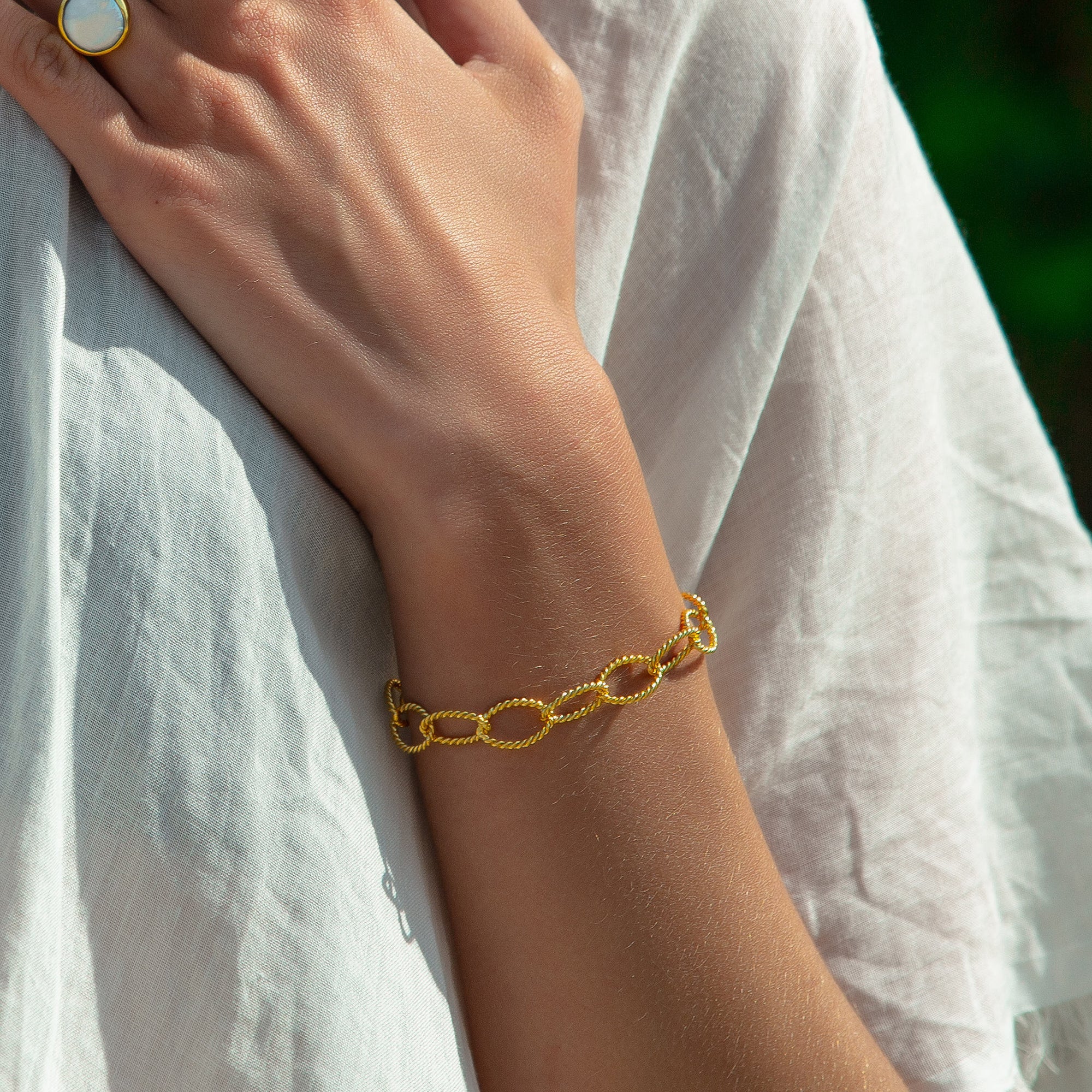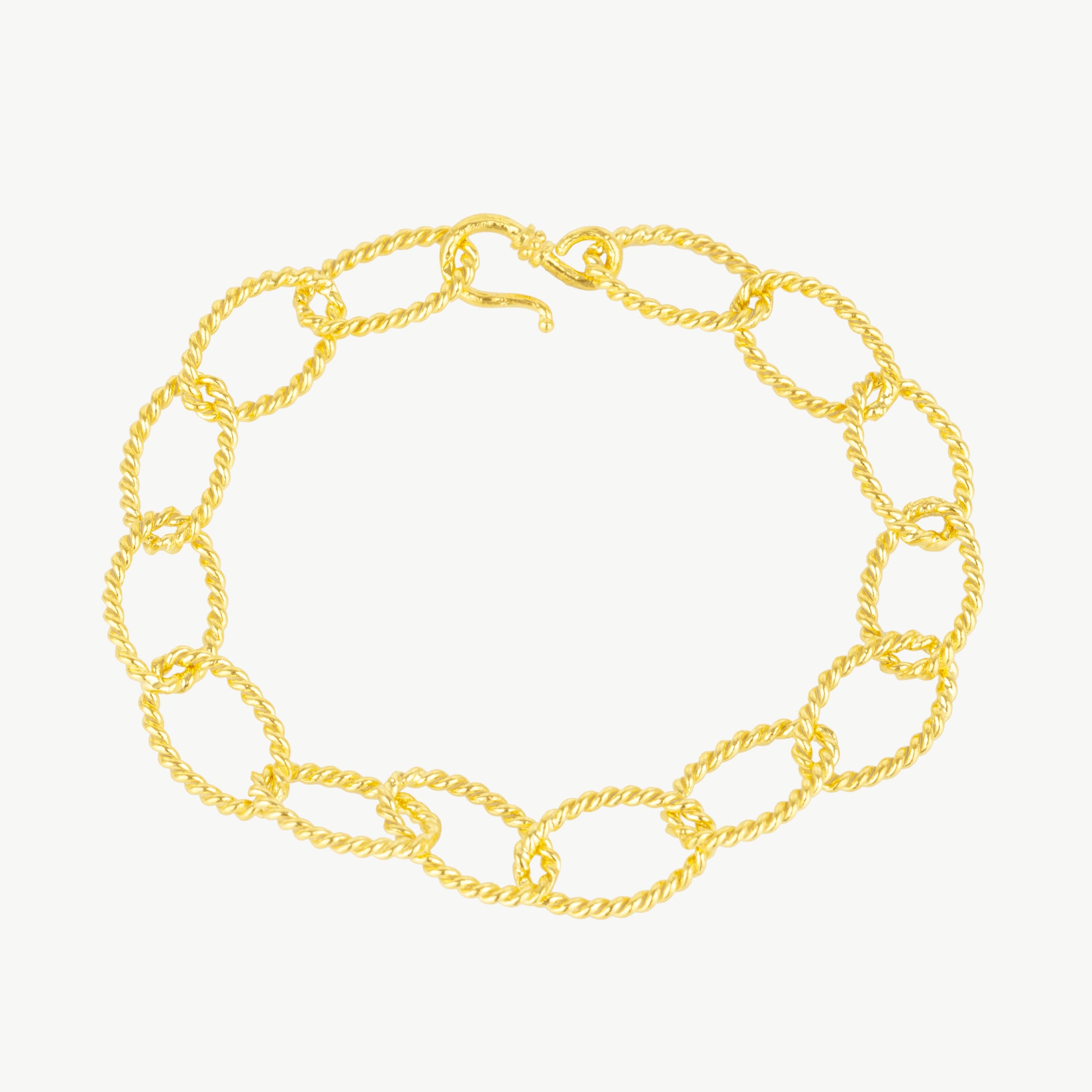 Add a touch of elegance to your outfit with our Twisted Elliptical Hoops Gold Bracelet. The adjustable 7 inch length ensures a perfect fit for any wrist. Stand out with the unique design and feel confident in your style.